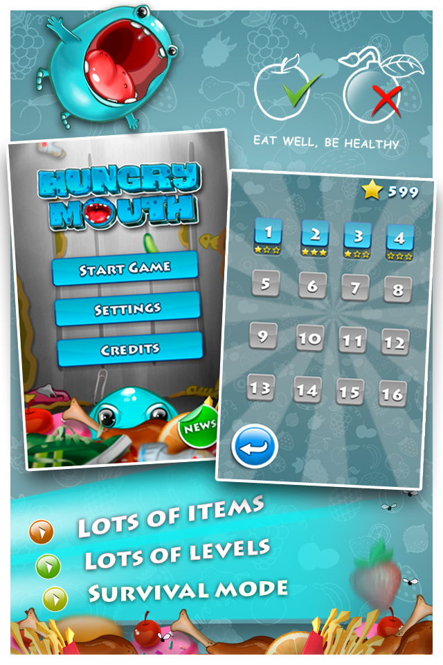 Hungry Mouth is a arcade game where you play a cute hungry monster. Your mission is feed monster with good food items, and eat target items to get bigger and happy.